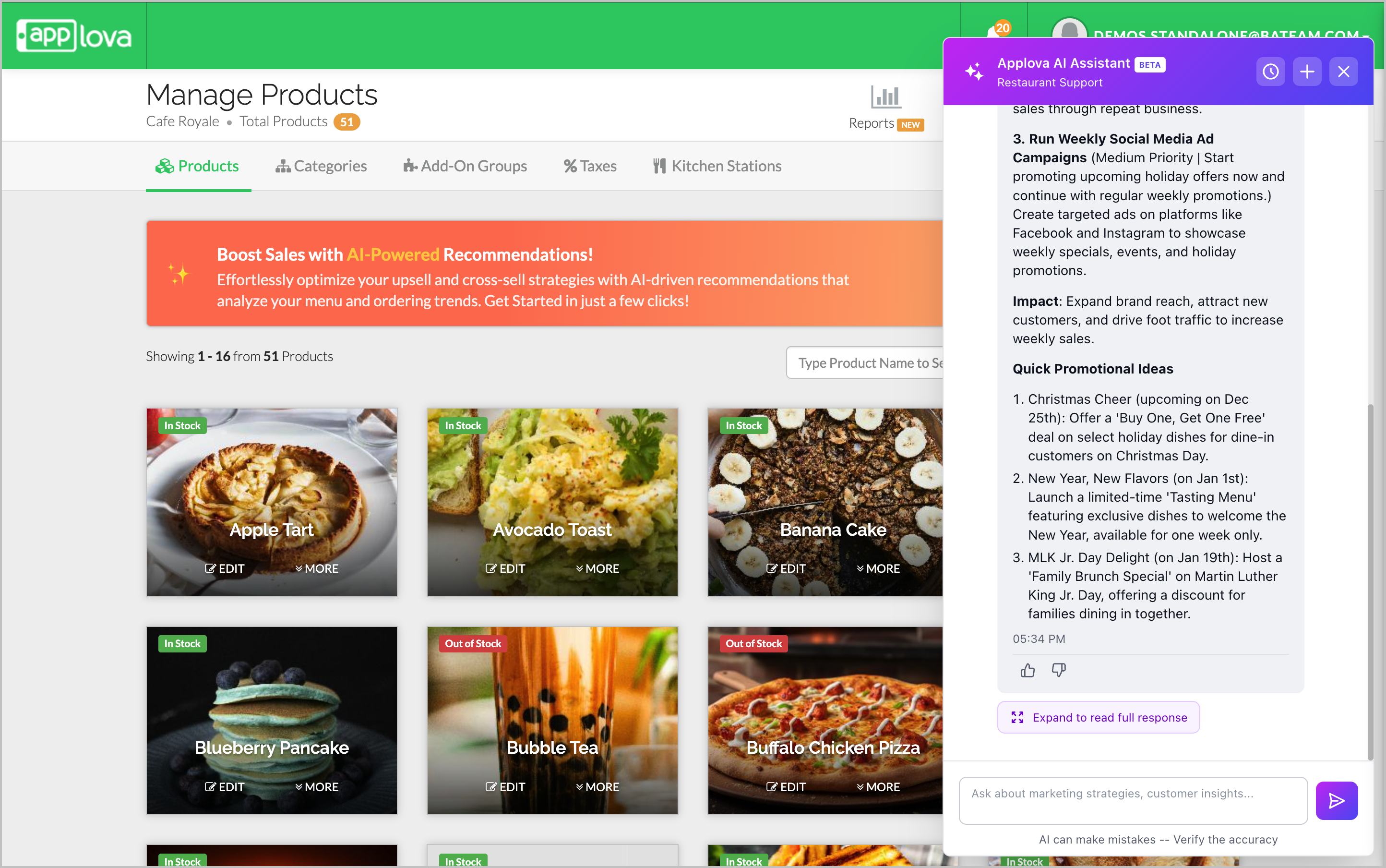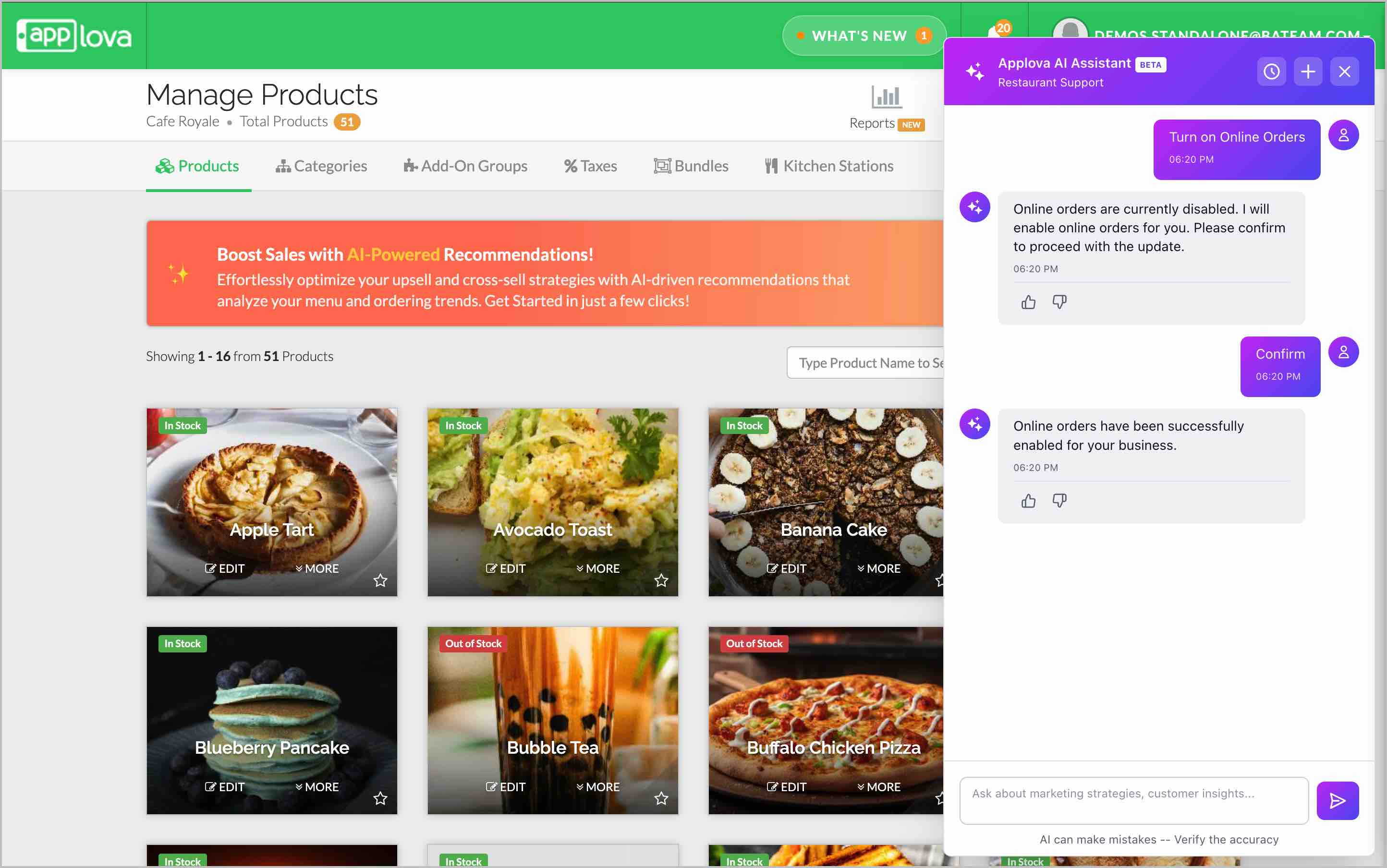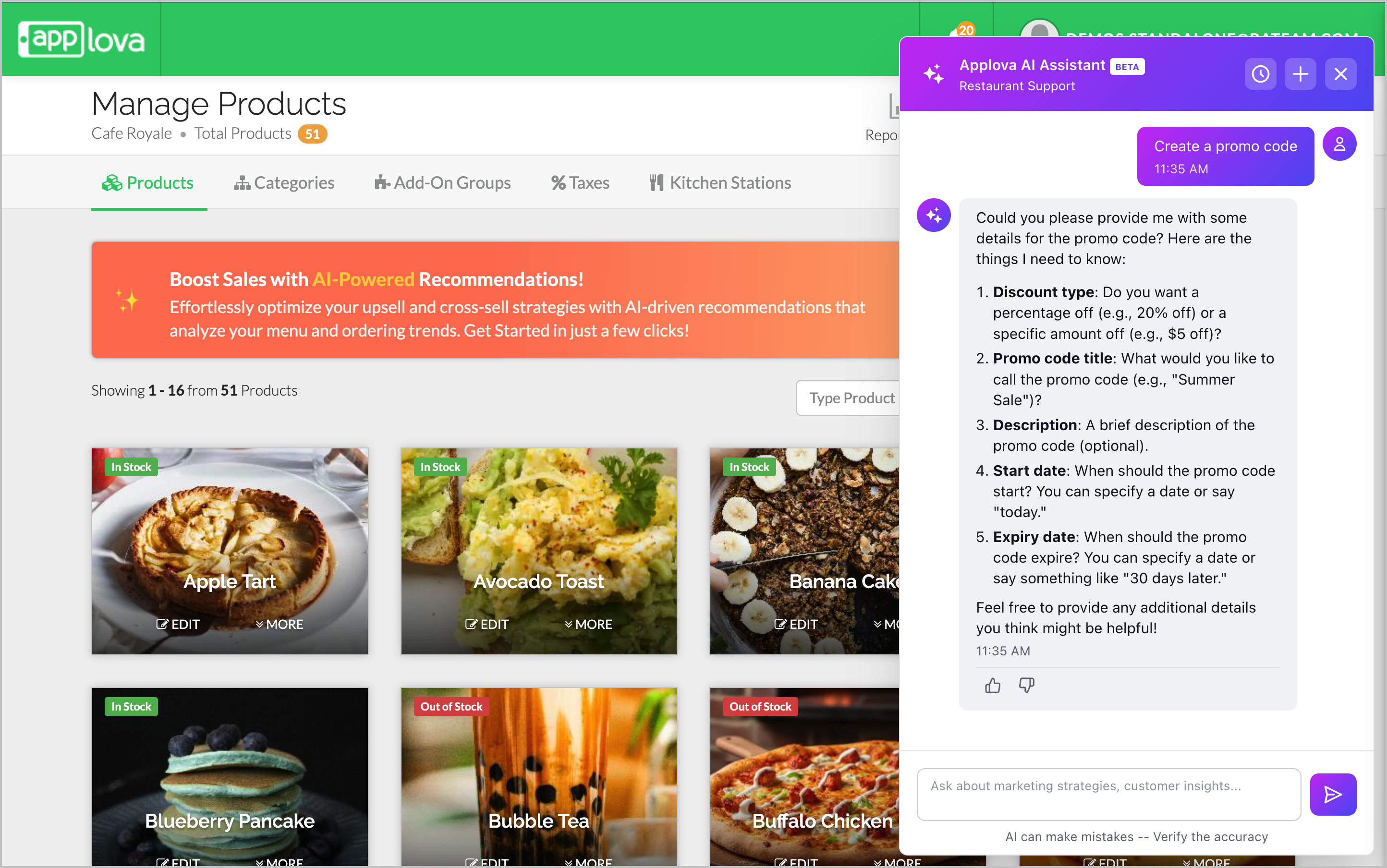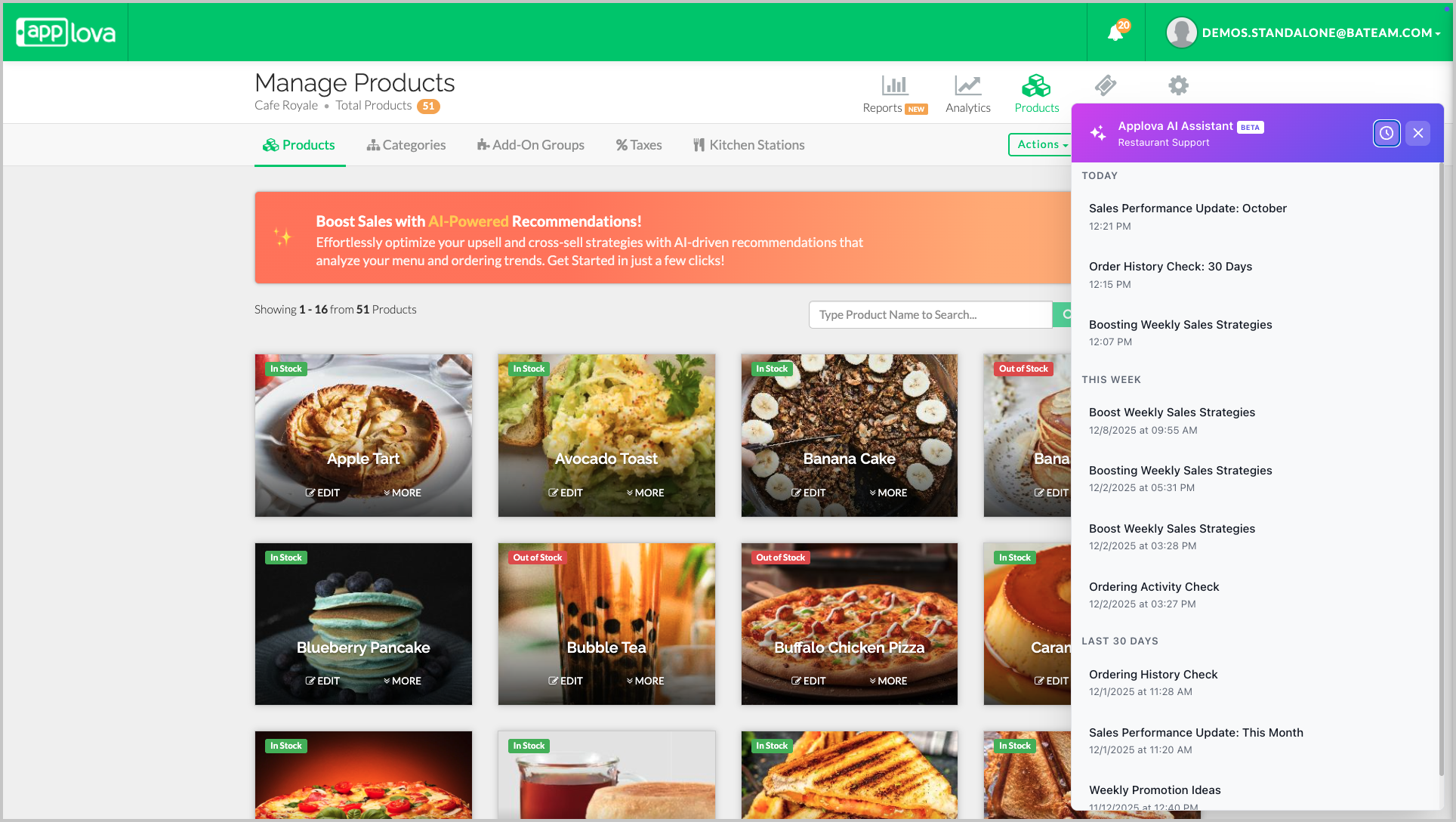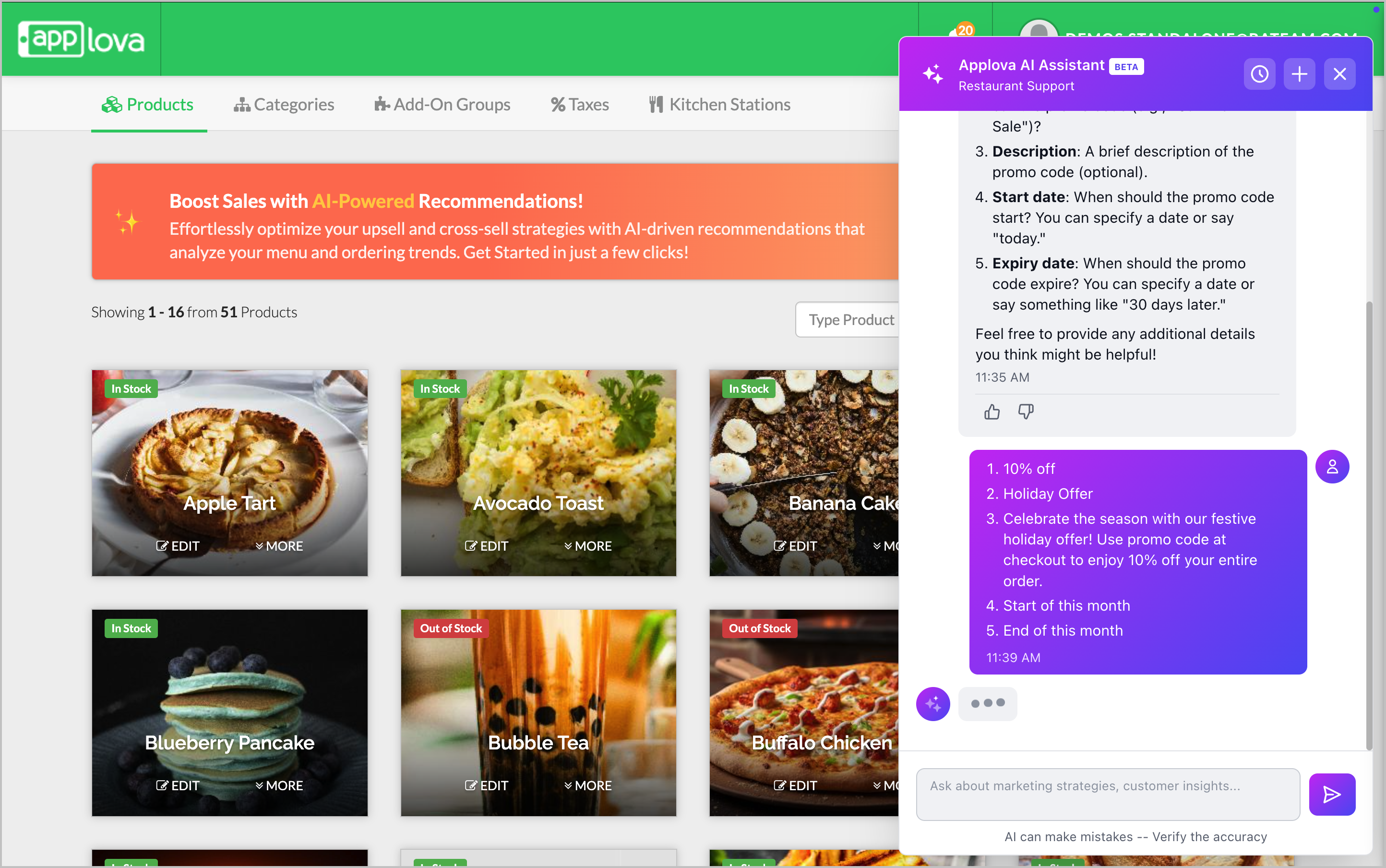 These examples are only starting points. The AI Assistant can respond to a wide variety of questions based on your restaurant’s operations and Applova’s available features.