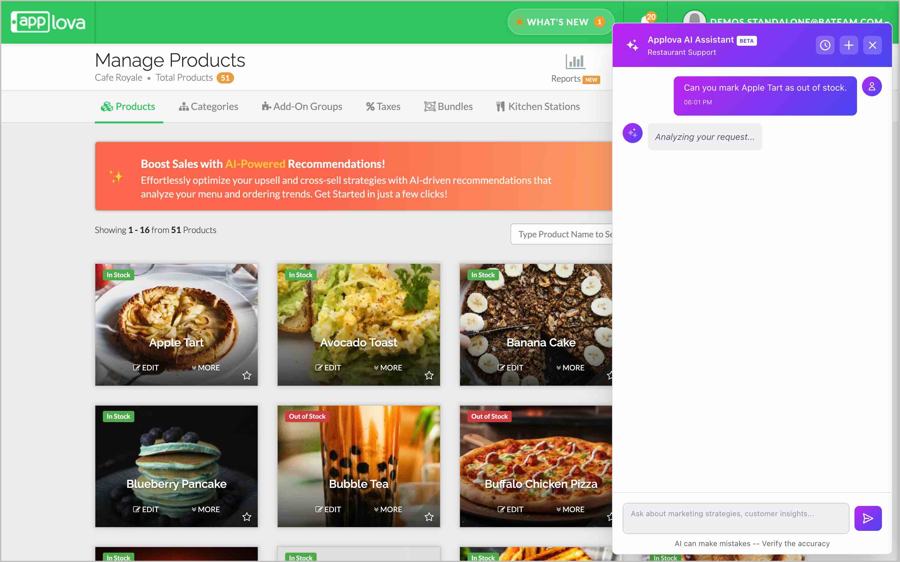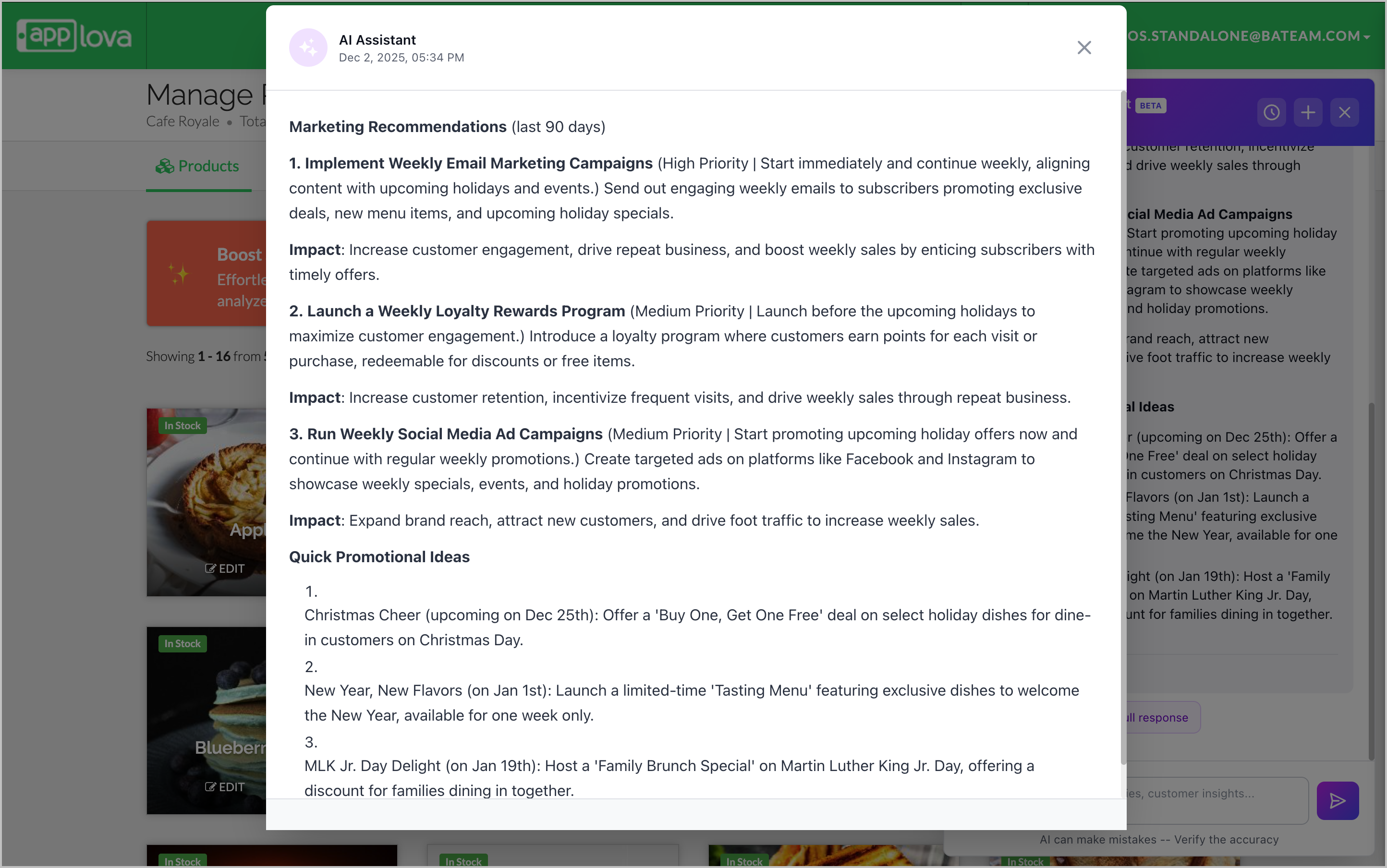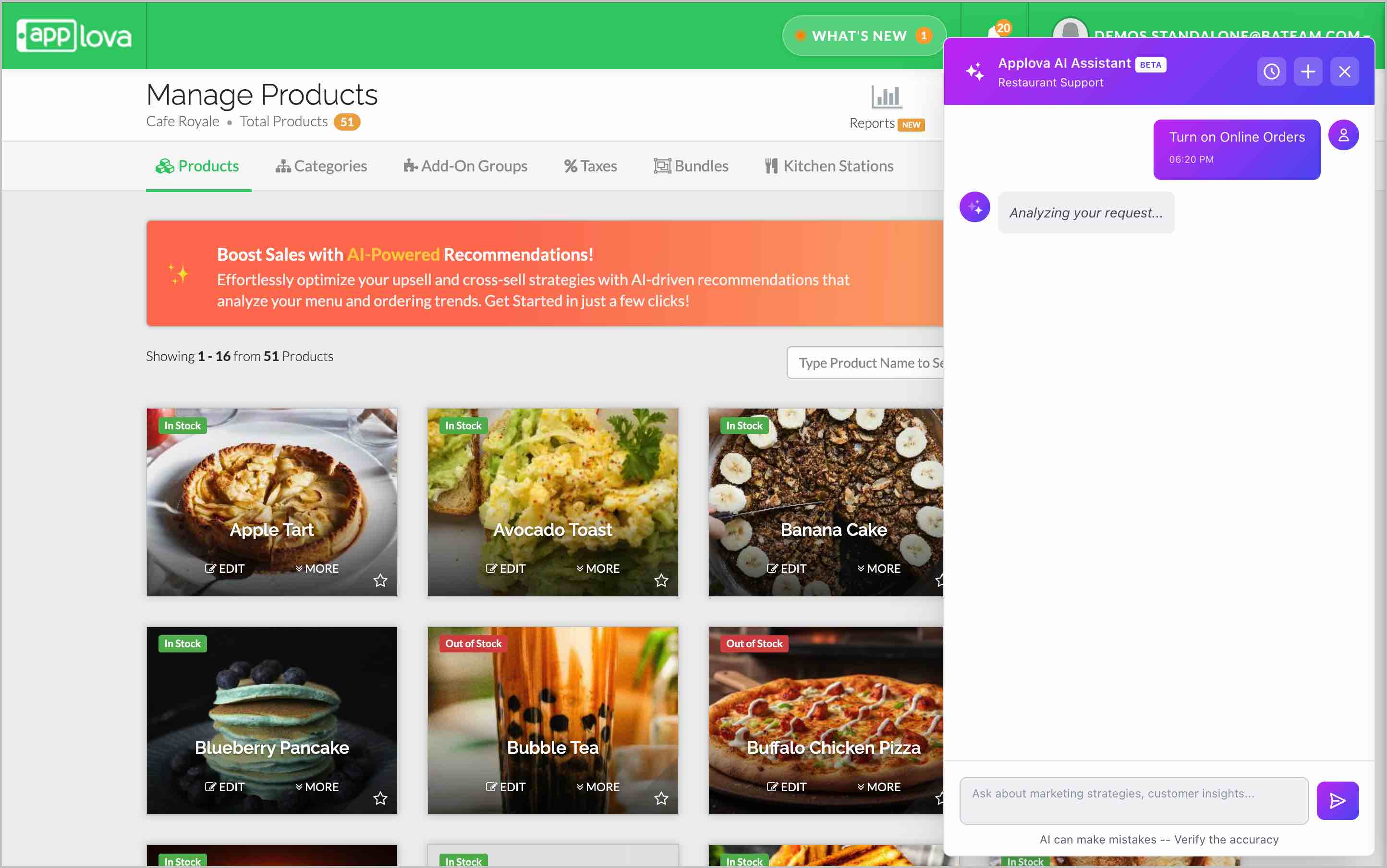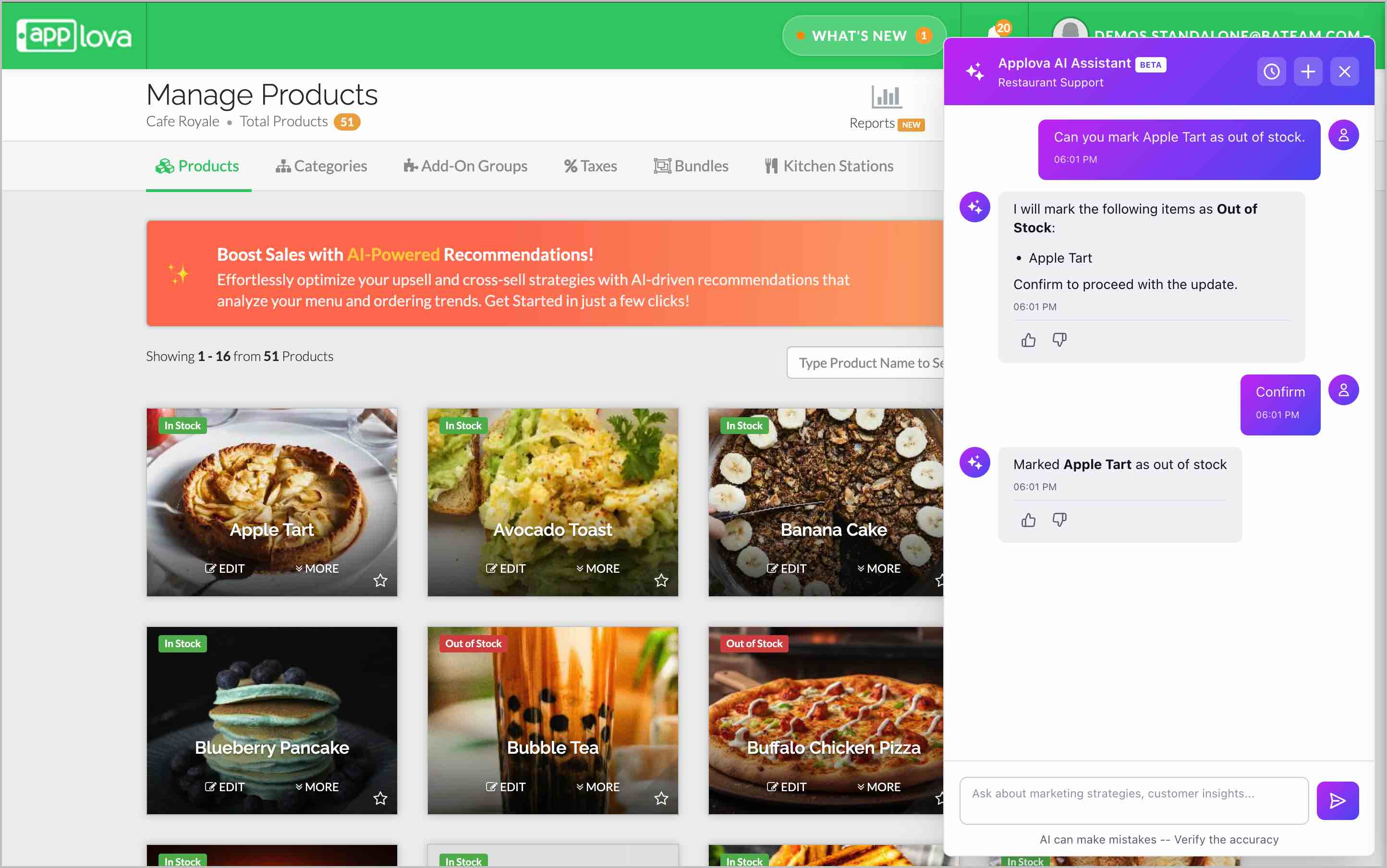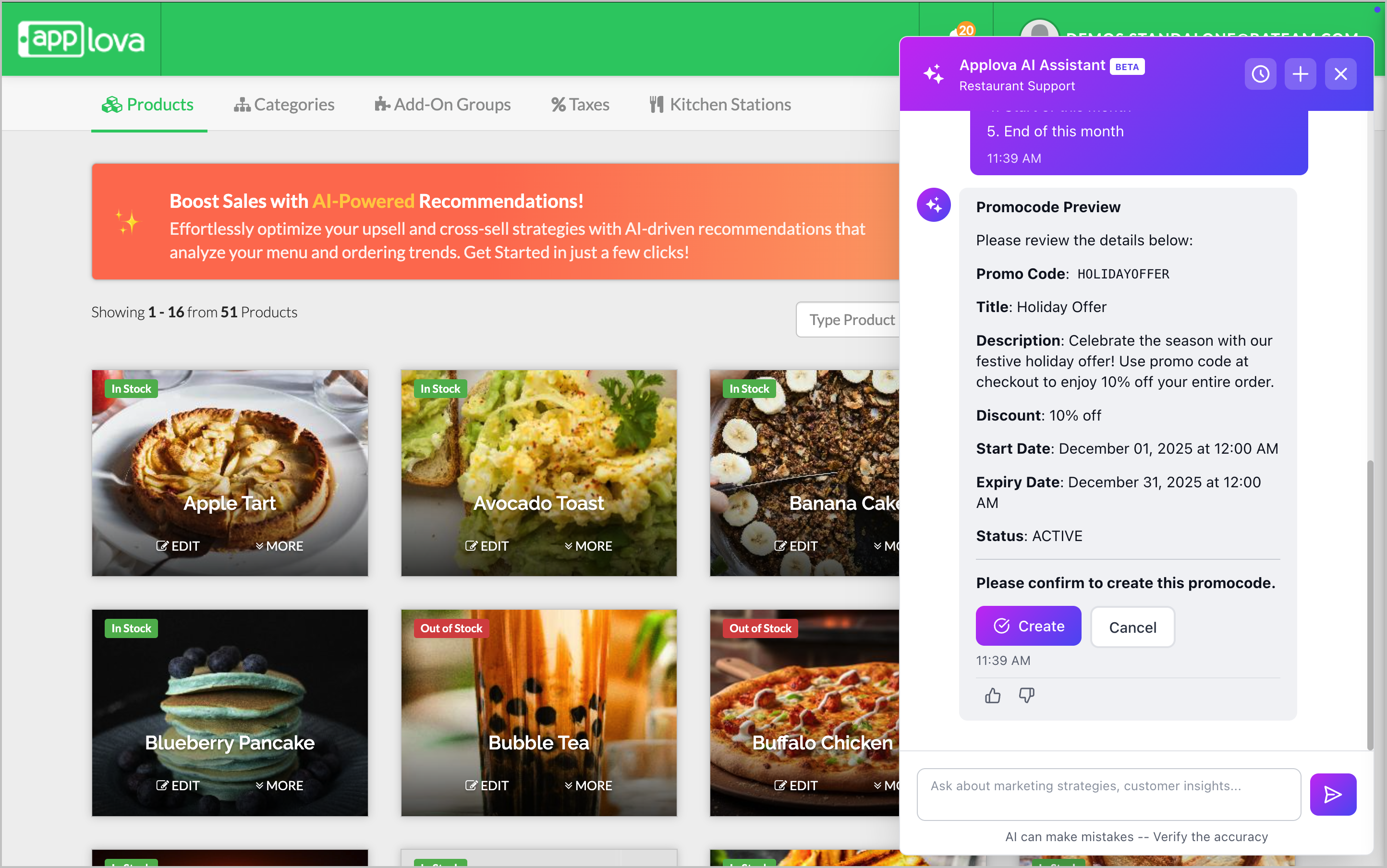 These examples are only starting points. The AI Assistant can respond to a wide variety of questions based on your restaurant’s operations and Applova’s available features.