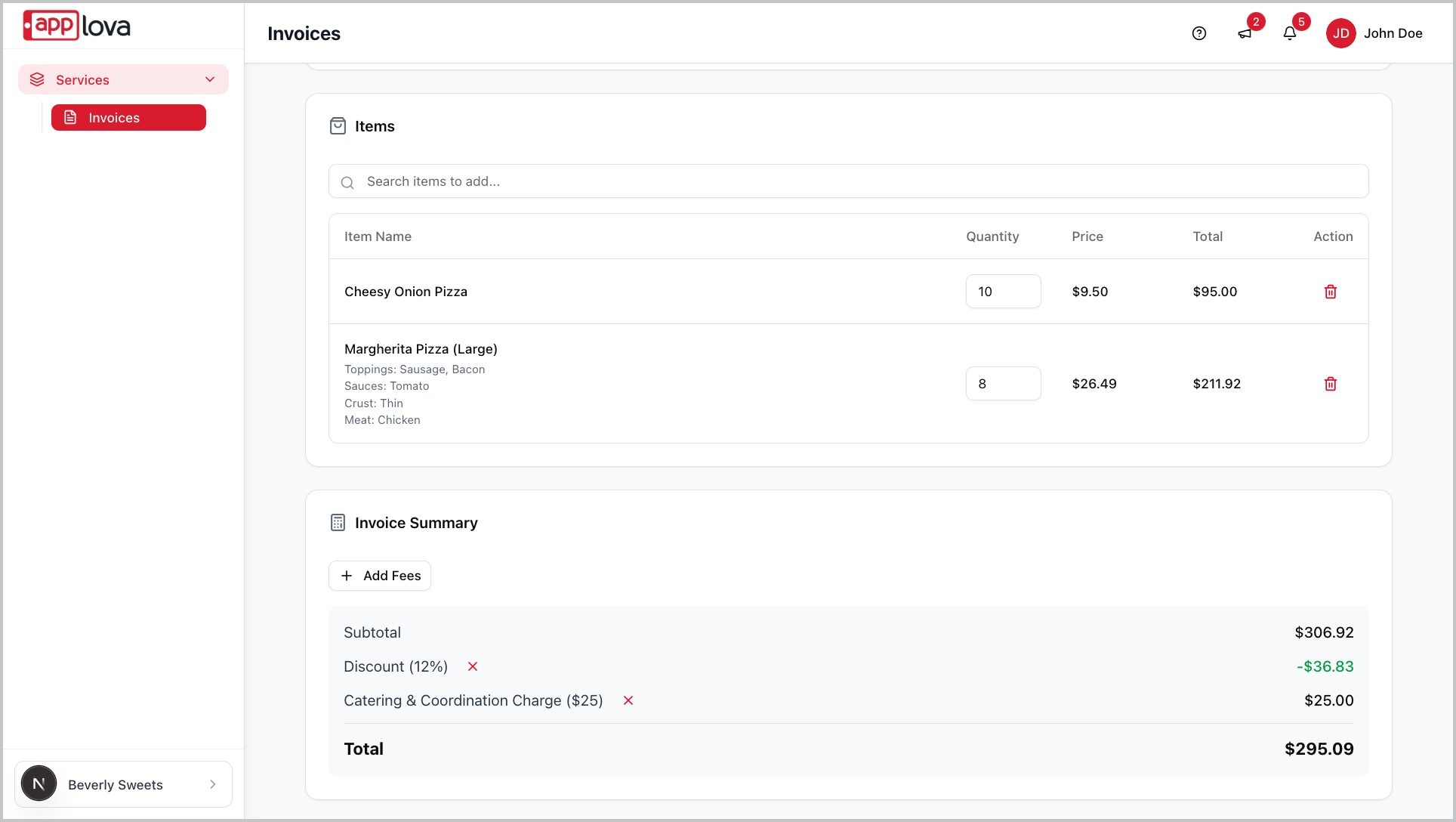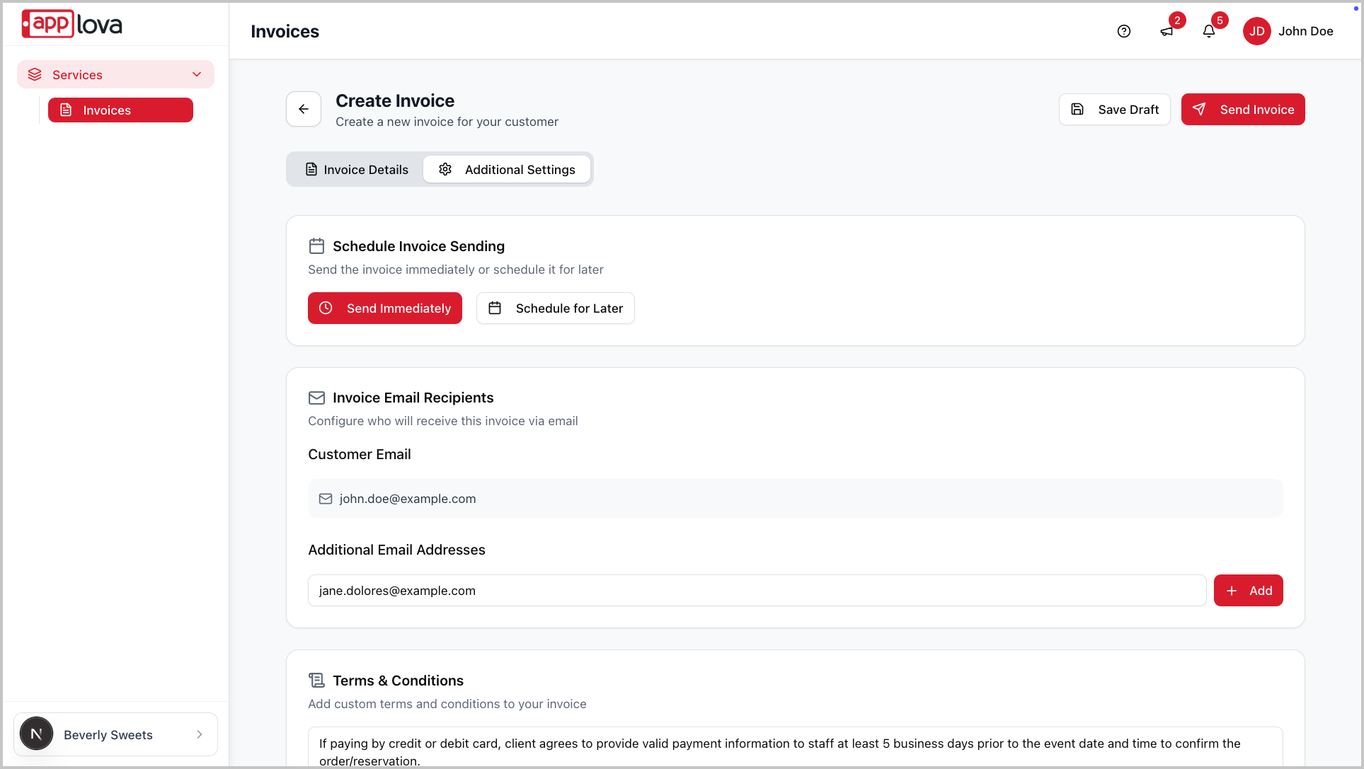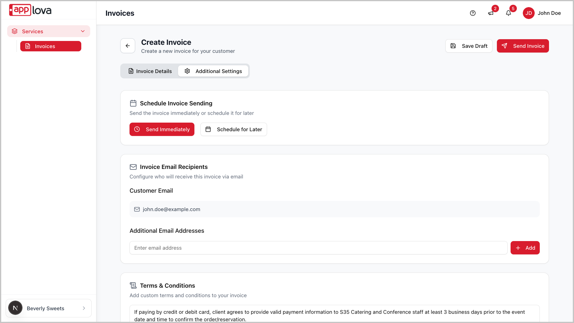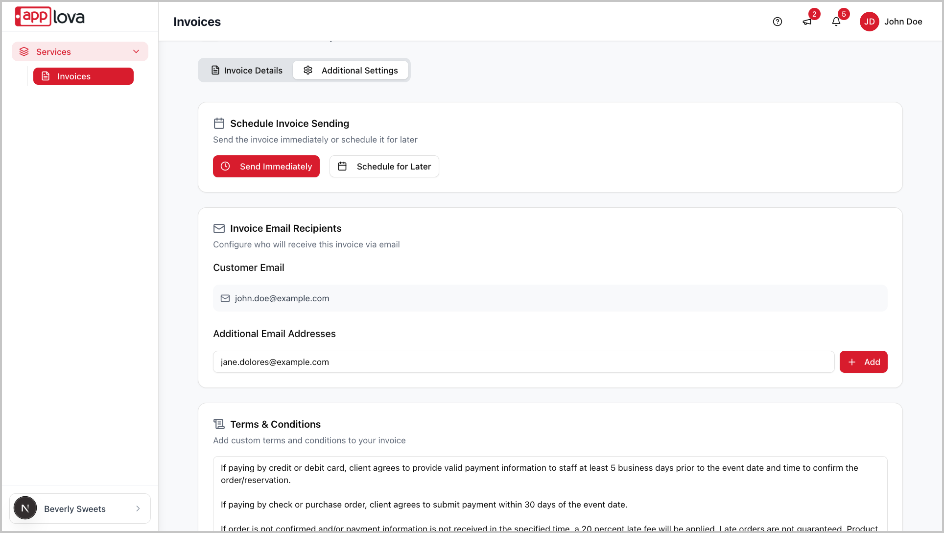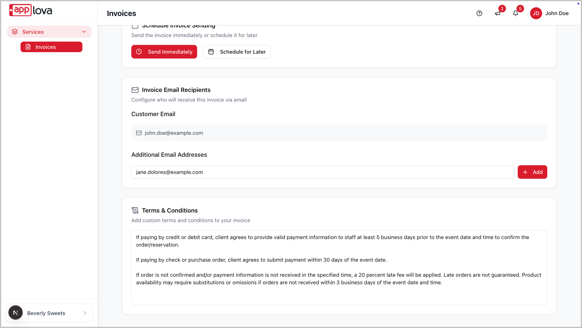 Create professional invoices for catering events directly from the portal, including customer details and payment due dates.