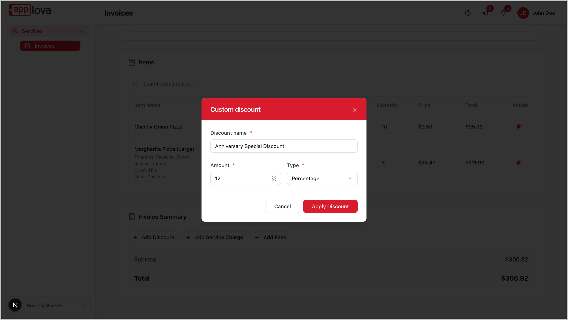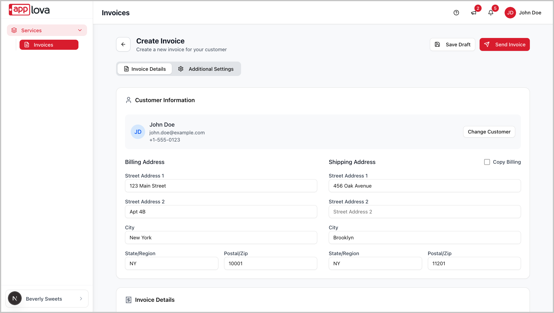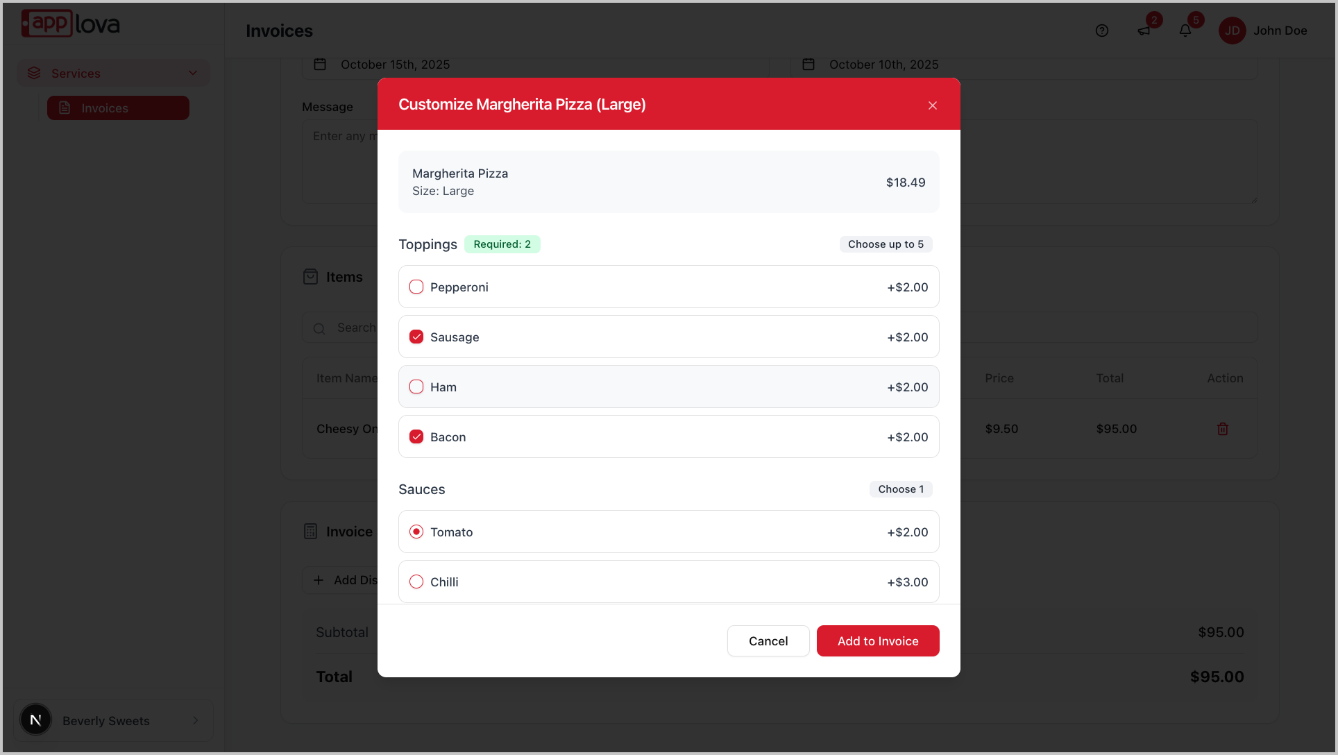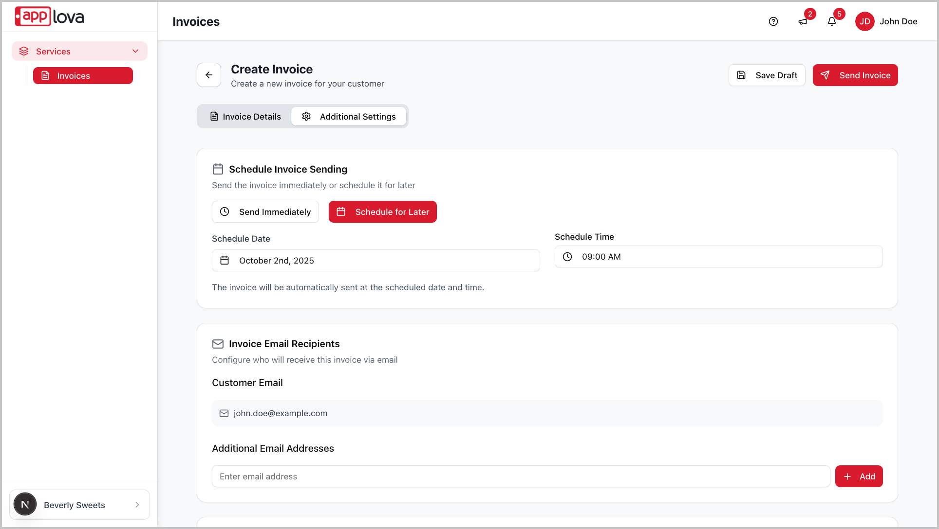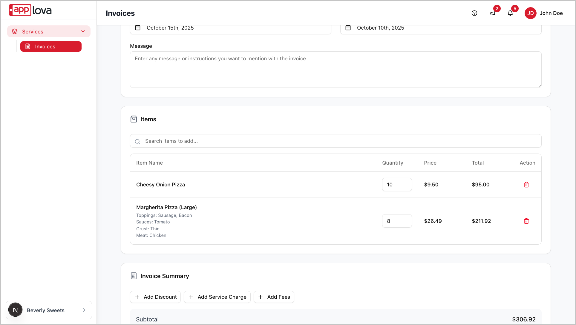 Create professional invoices for catering events directly from the portal, including customer details and payment due dates.