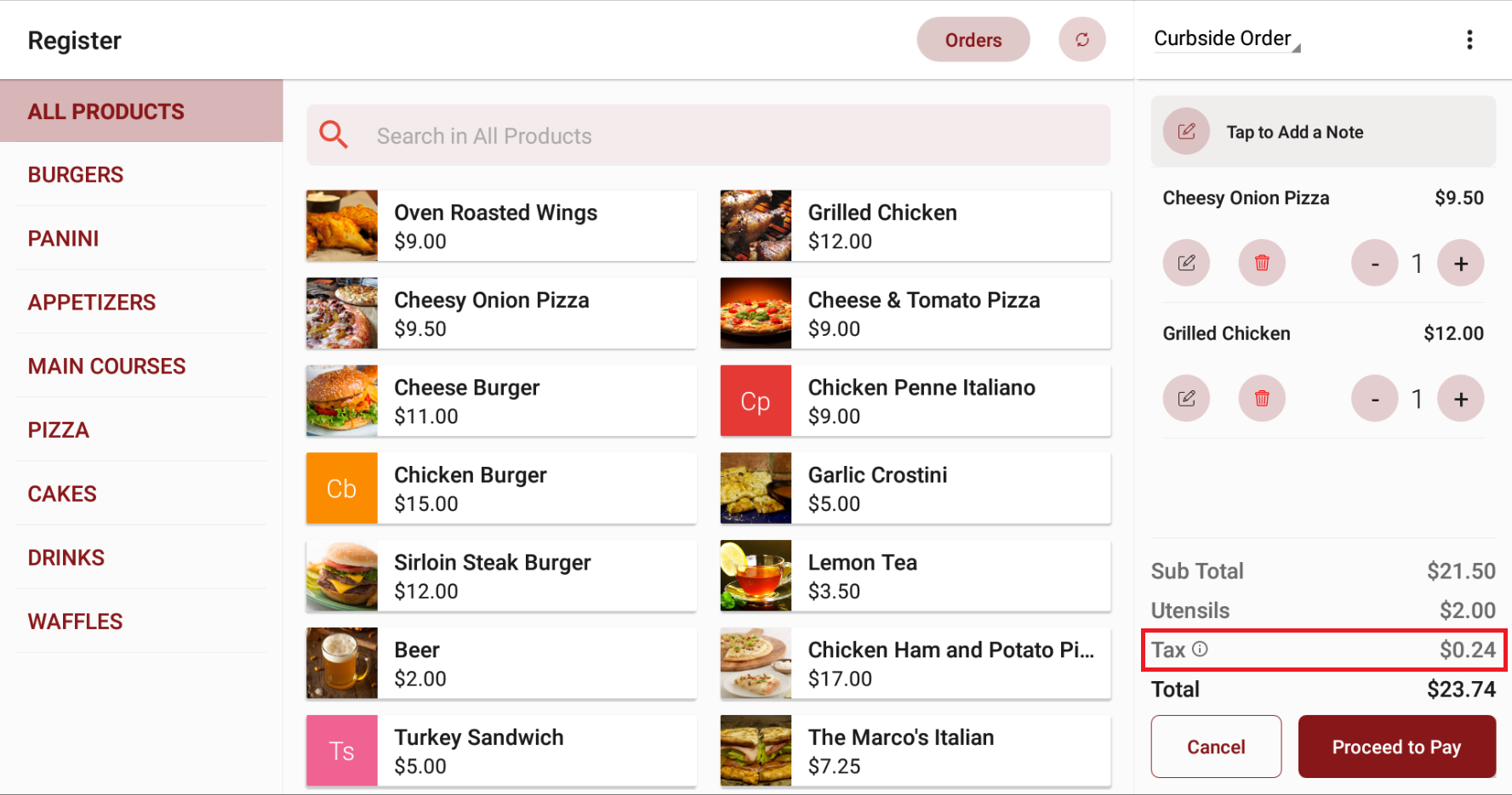 Then go to "Applova POS Register", and add items to the order. Once added, Sub Total will be shown along with Taxes (if added to the business).