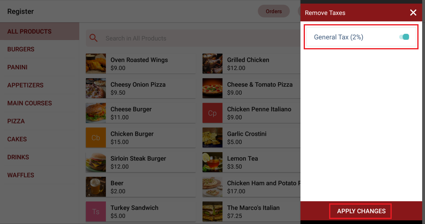 Then it will display the type of the tax that has been added. Disable the toggle to eliminate the applicable tax and tap on "Apply Changes" to proceed to pay without taxes.