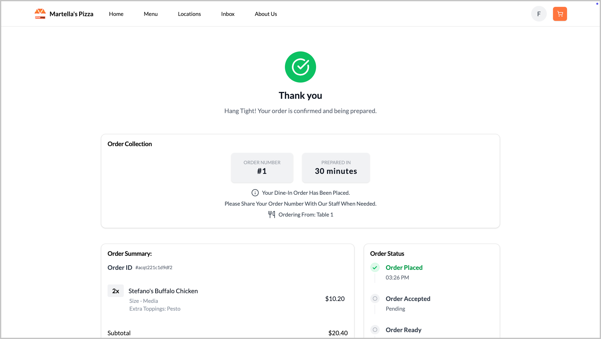 Once the order is placed, an Order Confirmation screen will appear with your order number, preparation time, and table details.
