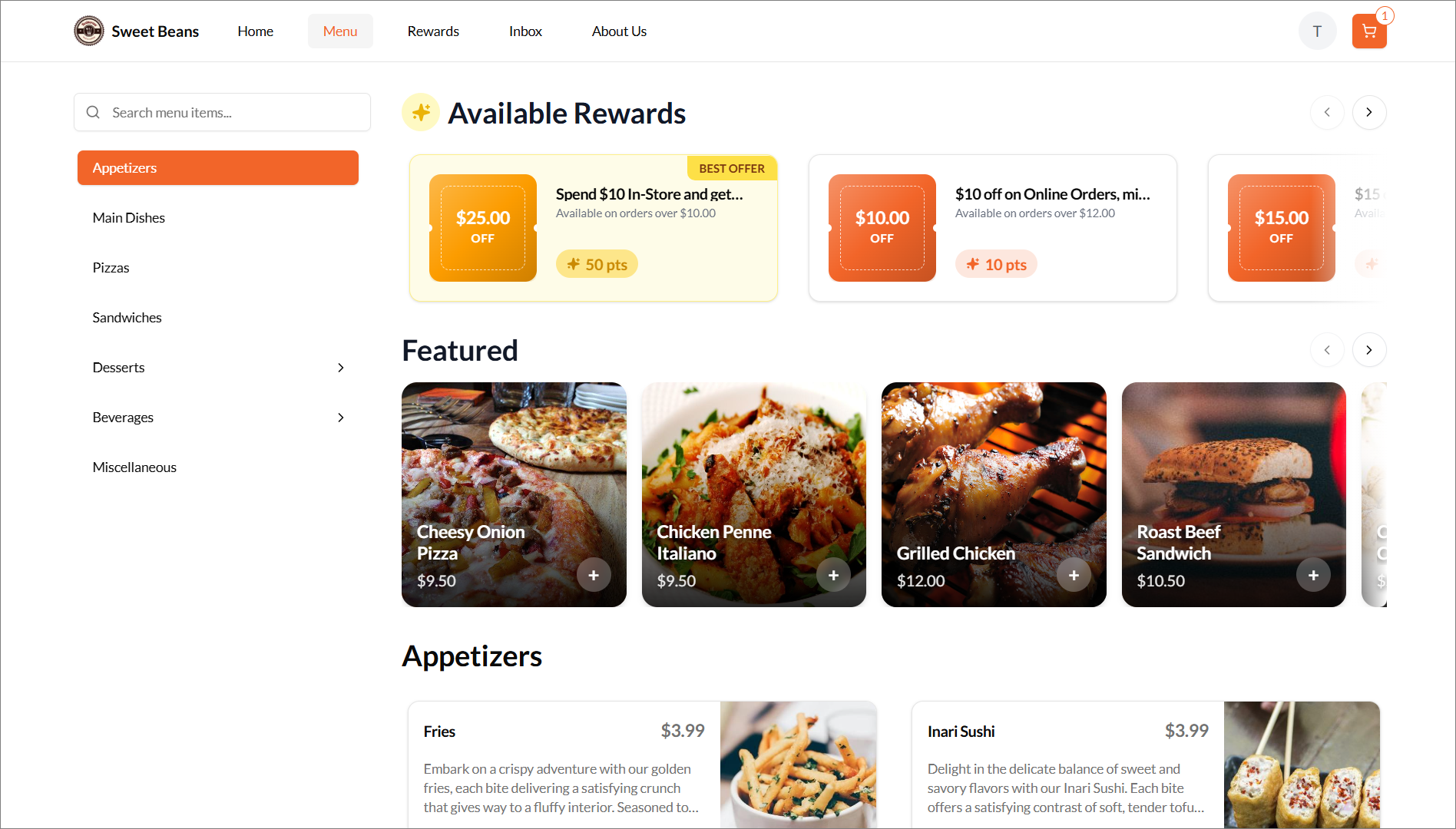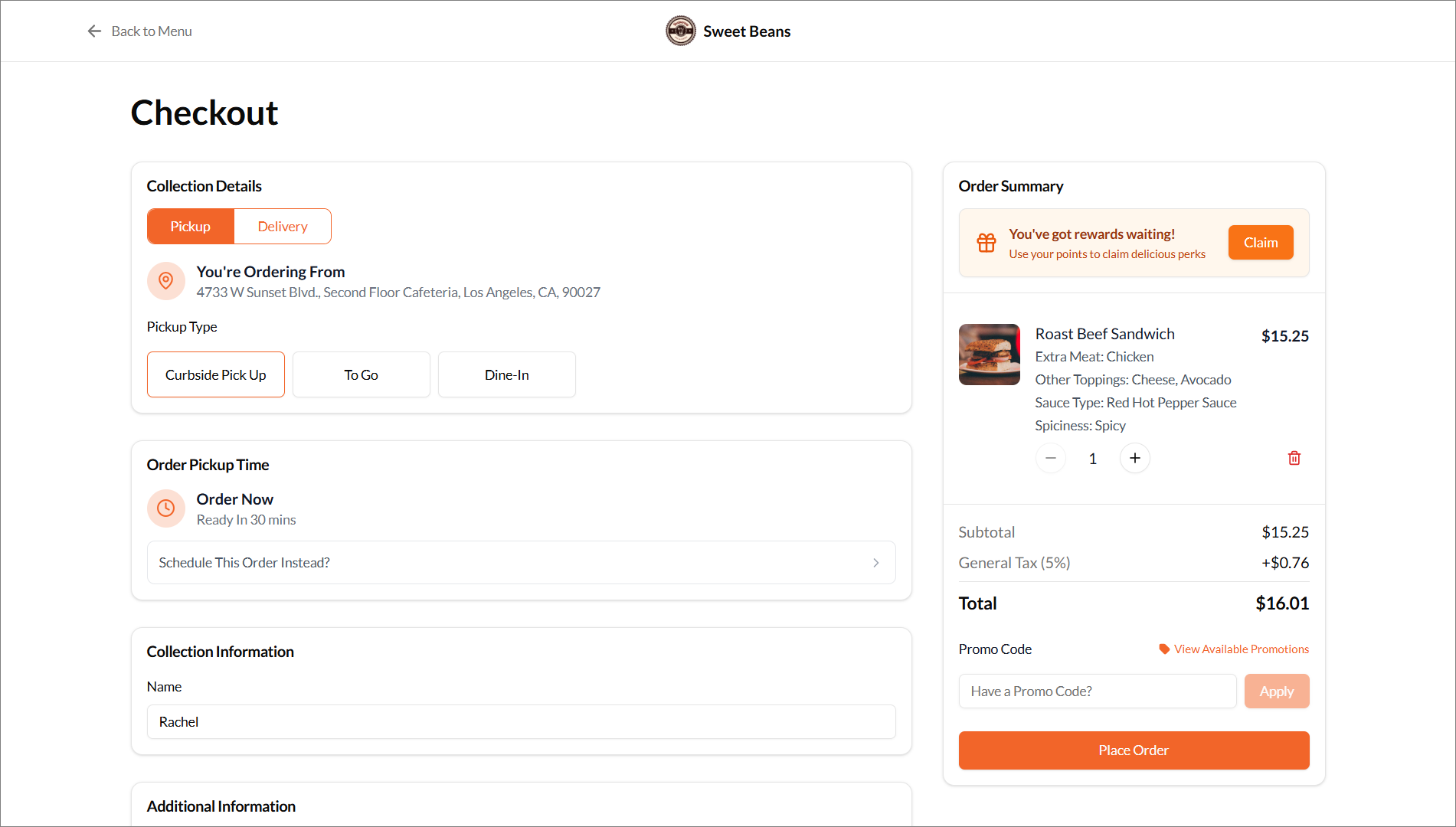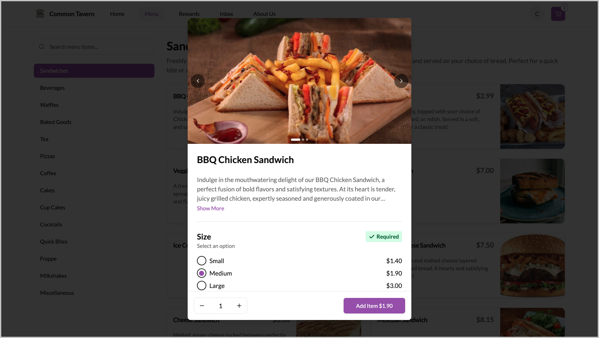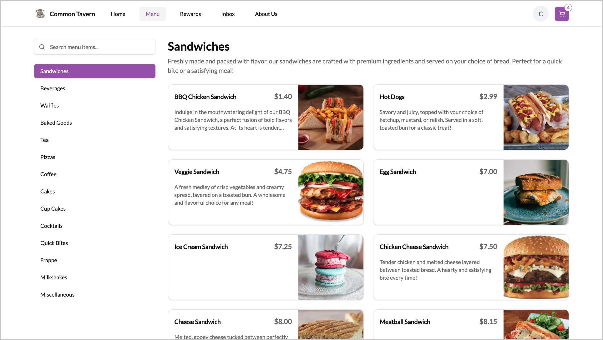 A customer logs into the Webstore, adds a BBQ Chicken Sandwich and sides to their cart, and proceeds to checkout.