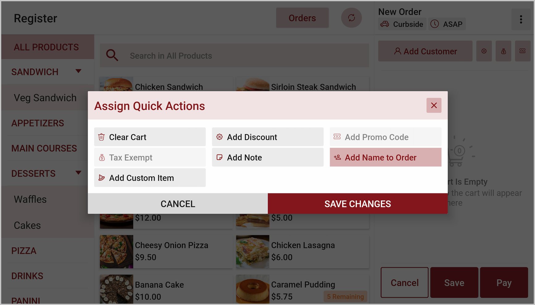 Downtown Burgers, a busy diner in New York City, frequently updates its POS layout to match the team’s changing priorities during rush hours. To streamline checkout and reduce unnecessary steps, the manager decides to remove the “Add Discount” quick action—used only during special promotions—and replace it with “Add Note.”