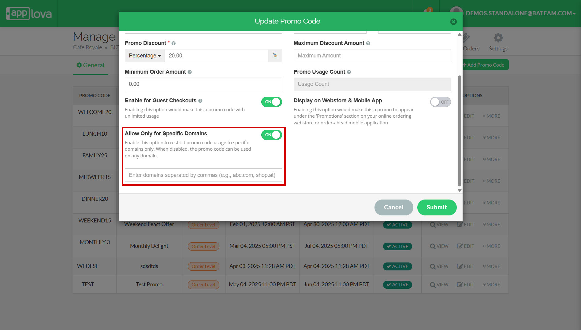 There you can create a new promo code or select an existing one to edit. Toggle ON the "Allow Only for Specific Domains" option.